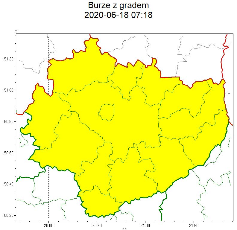 Obszar (w nawiasie numer ostrzeżenia dla powiatu) powiaty: buski(54), jędrzejowski(49), kazimierski(52), Kielce(49), kielecki(51), konecki(45), opatowski(52), ostrowiecki(49), pińczowski(51), sandomierski(53), skarżyski(48), starachowicki(48), staszowski(54), włoszczowski(47)